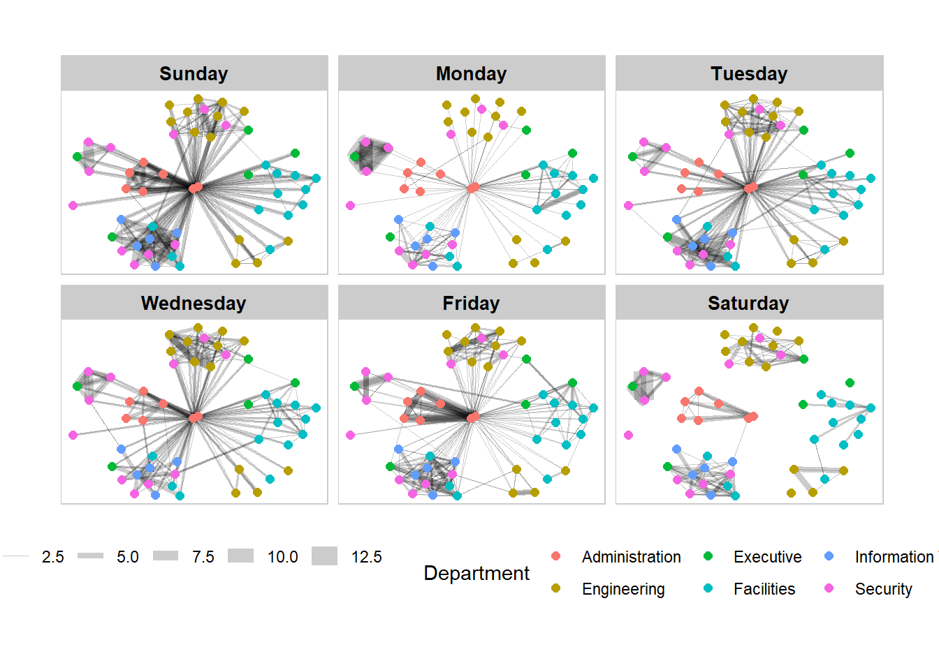 set_graph_style() g <- ggraph(GAStech_graph, layout = "nicely") + geom_edge_link(aes(width=Weight), alpha=0.2) + scale_edge_width(range = c(0.1, 5)) + geom_node_point(aes(colour = Department), size = 2) g + facet_edges(~Weekday) + th_foreground(foreground = "grey80", border = TRUE) + theme(legend.position = 'bottom')