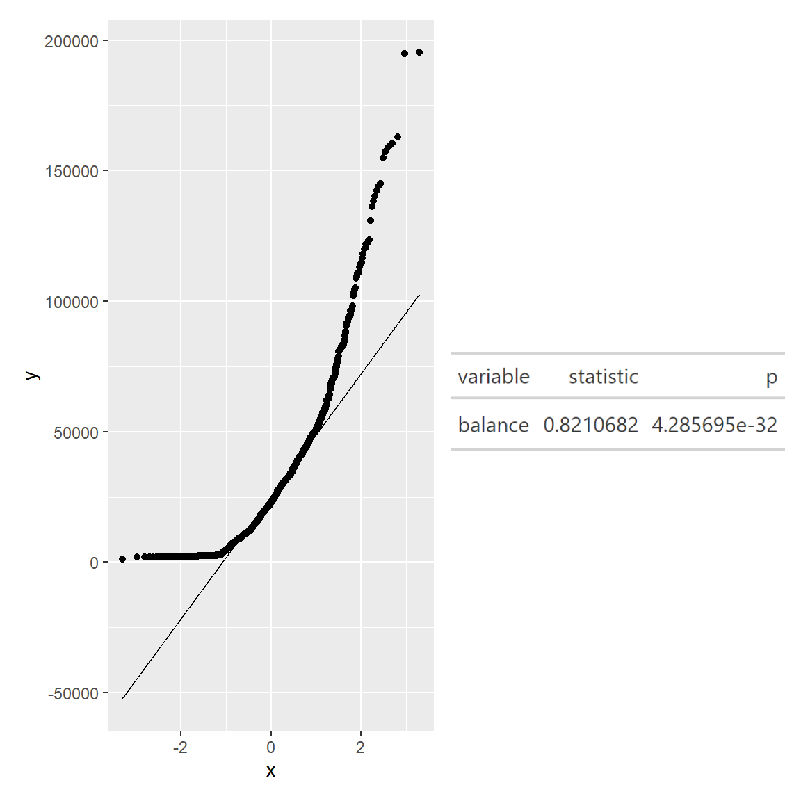 qq <- ggplot(merged_df, aes(sample=balance))+stat_qq()+stat_qq_line()