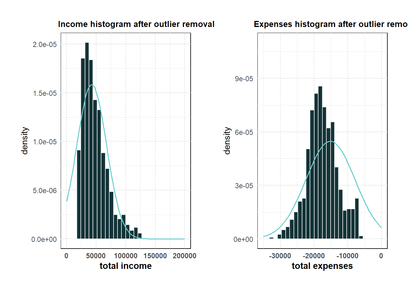 This step is to remove “expenses” and “income” outliers. (to retain more data, I adjusted the 75%(Q3)/25%(Q1) quantile to 90%/10% quantile in the outlier formula respectively.