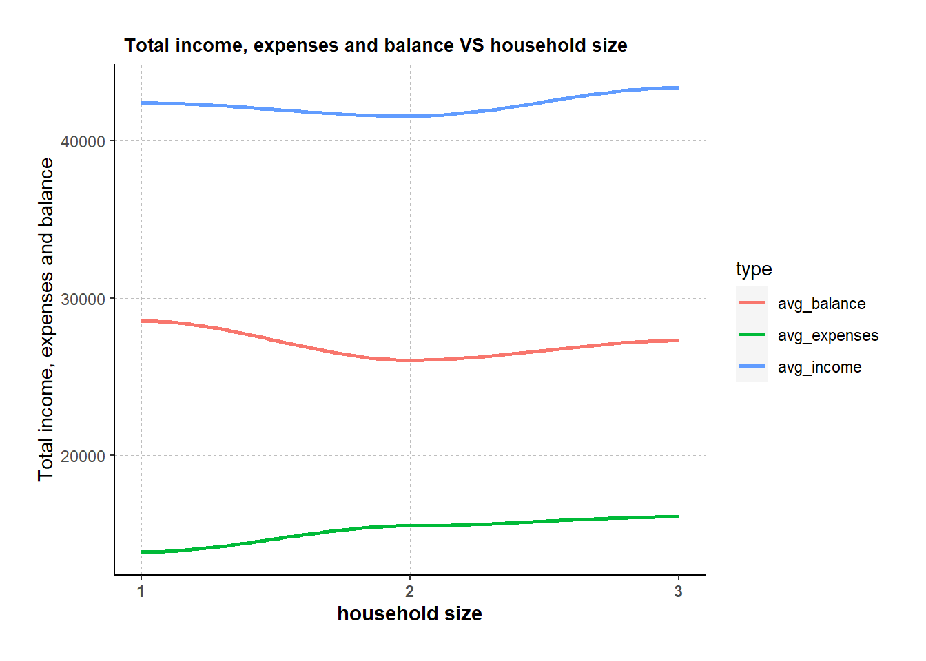 labs(title = "Total income, expenses and balance VS household size", x = 'household size', y = 'Total income, expenses and balance') +