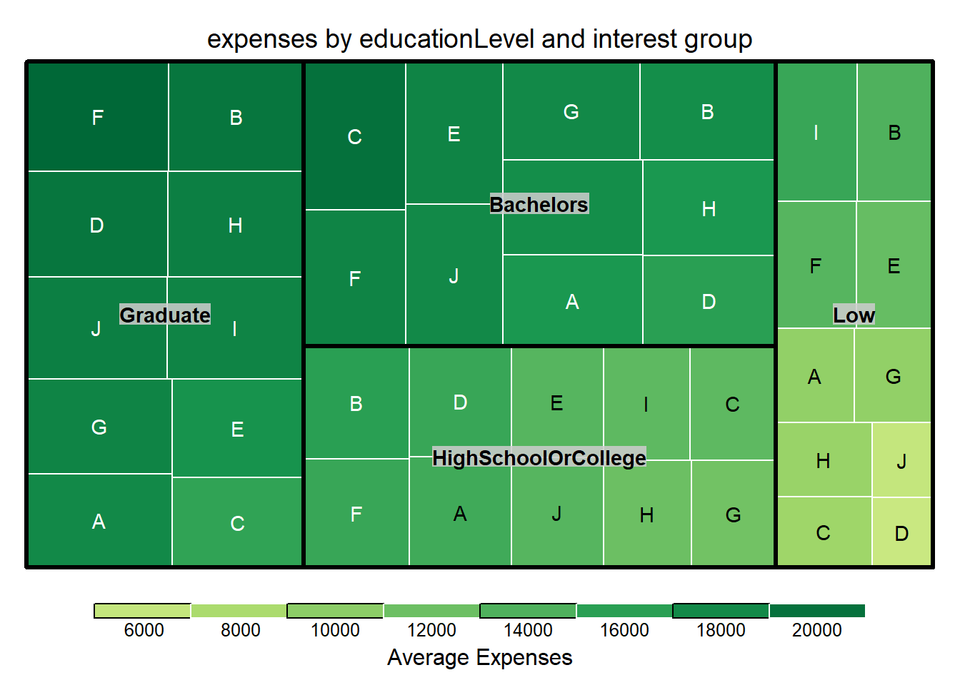 In this section, a treemap is used for a quick overall glimpse of expenses across different education levels and interest groups. Graduate and bachelors are having higher expenses than college or lower education level. Interest group B/F has relatively high proportion across all education levels.