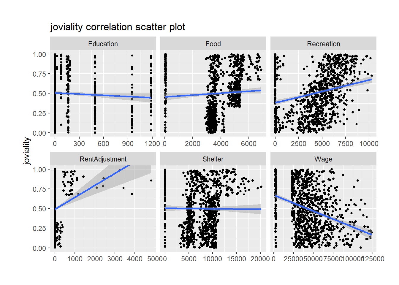 There is no good correlation between joviality and education, food or shelter. While recreation shows positive correlation with joviality, the more the participants spend on recreation, the happier they are. Surprisingly wage and joviality are in negative correlation.